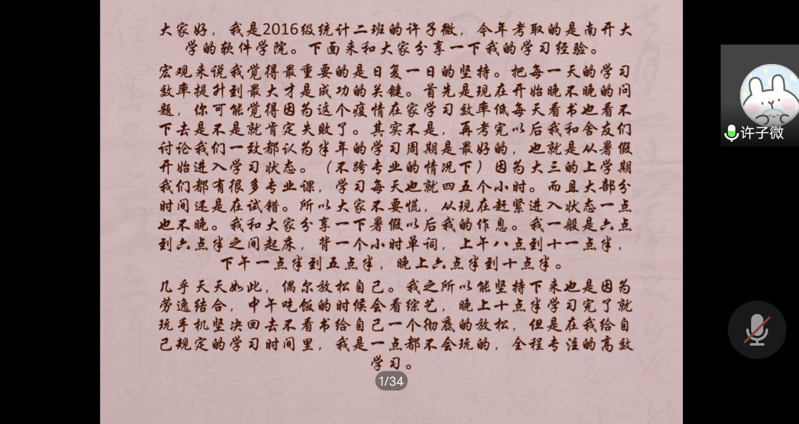 学习部通过腾讯会议在线组织举办“群英聚首,剑指研峰”线上考研经验交流大会。本次会议特邀2016级考研成绩优异的9位同学:许子微、陈晨、黄婧茹、潘淑霞、王梦、袁庆颖、张轲、朱蒙蒙以及仲昭慧进行经验分享和指导。17级、18级、19级共110余人到会聆听。