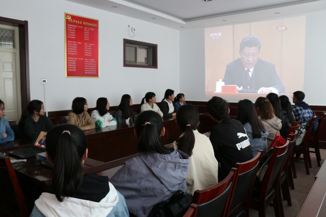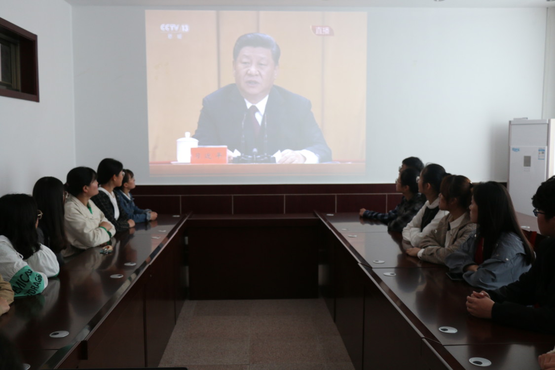 系楼213观看习近平总书记讲话直播,畅谈大学生青年如何在新时代传承五四精神,纪念五四运动100周年。