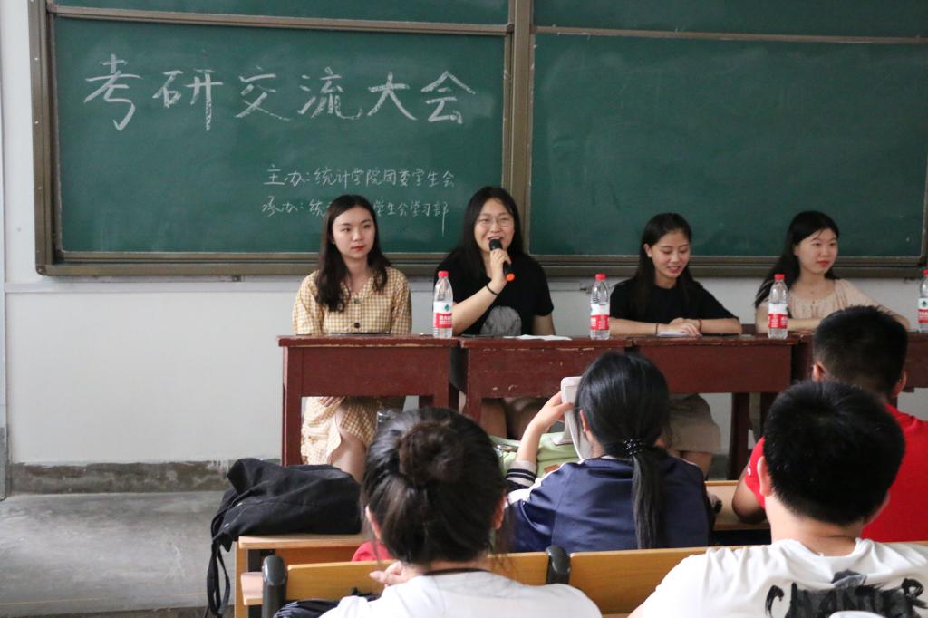 交流会中,四位学生代表分别对专业课、英语以及政治的学习进行了针对性的介绍。首先,被山东大学录取的李晓雪同学综合性的介绍了读研的必要性、备考期间应该注意的问题以及报考院系的选择;被东华大学录取的李璇同学和被东北财经大学录取的杨帆同学向同学们介绍了如何备考英语和政治;被华中师范大学录取的张瑜同学具体传达了统计学专业课的备考经验。他们结合自身的考研经历,对备考过程中自我心态的调整以及初试和复试中的注意事项进行了分享交流。现场提问环节同学们积极踊跃,四位同学也有针对性的耐心解答疑惑,赢得了同学们阵阵热烈掌声。