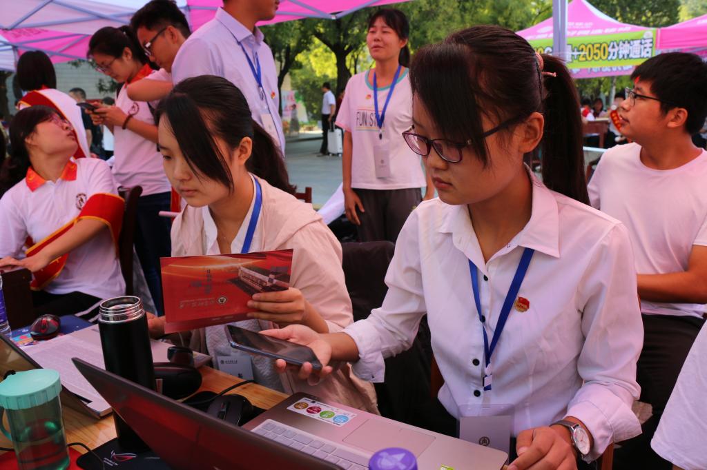的报到情况,慰问了现场的工作人员,并与新生亲切交谈,向他们致以热烈的欢迎与祝贺。迎新工作组多日前便紧锣密鼓地开展了筹备工作,明确了人员分工,备好了所需材料。随着现场工作的进行,工作人员对报道流程更加熟悉,默契配合,使得整个报名过程紧凑通畅而不失细致周到。工作人员扫描新生录取通知书上的条形码进行签到,在核对新生身份信息无误后,工作人员向新生发放校园卡钥匙等物品,同时,国产自拍