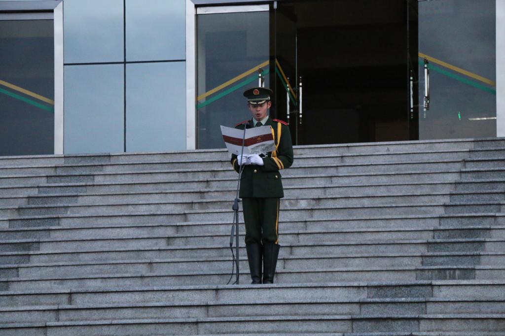首先,国旗护卫队队长齐昊为本次升旗仪式代表发言,他就缅怀历史,开拓未来发表演讲,强调中国富强需要青年一代的担当。鼓励同学们牢记历史,把无限的爱国情怀转化为不衰的动力,付诸于建设祖国的伟大实践中。演讲结束后,升旗仪式正式开始。在全体师生的注目下,英姿飒爽的国旗护卫队护送五星红旗进场。行礼完毕,伴随着庄严的国歌,五星红旗冉冉升起,全体师生肃立行注目礼,对祖国无限的热爱与自豪油然而生。