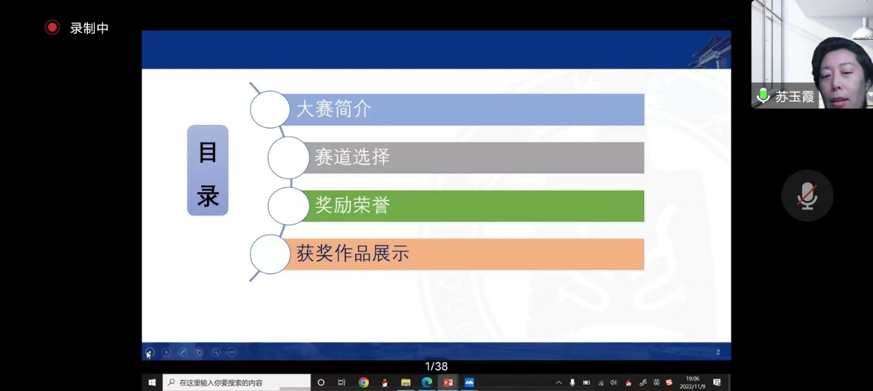 会议伊始,主持人致开场白,介绍了本次与会现场嘉宾及此次活动的意义。之后由苏玉霞老师对山东省大学生科技创新大赛进行经验分享。苏老师从大赛目的、大赛原则和赛程安排三个方面对山东省大学生科技创新大赛进行了详细介绍。同时,苏老师结合多年指导学生参赛的丰富经历对赛道选择等问题展开讲解,举例介绍了创意创新的8种方式和大赛的奖励荣誉,并对获奖作品进行展示和讲解。苏老师的详细介绍和热情鼓动,激发了同学们的参赛热情,多数参会同学表示将积极参与本次大赛。