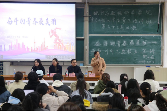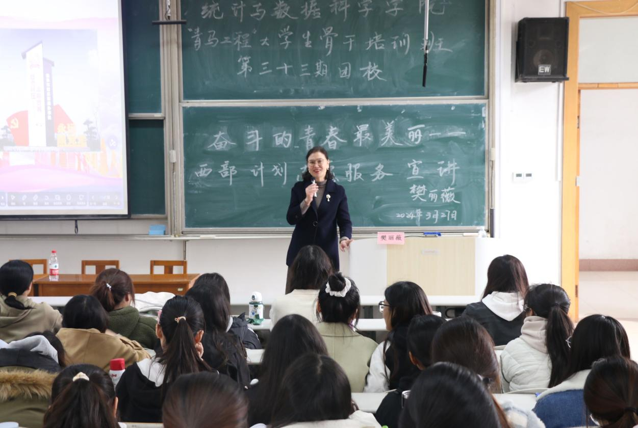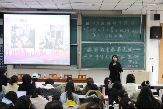 于3月27日下午两点在综合楼206教室举办“青马工程”大学生骨干培训班暨第三十三期团校培训第三课。本次青马课以“奋斗的青春最美丽——西部计划志愿服务”为主题。本次课程邀请经济学院2009级校友时庄街道团工委书记樊丽薇主讲,国产自拍