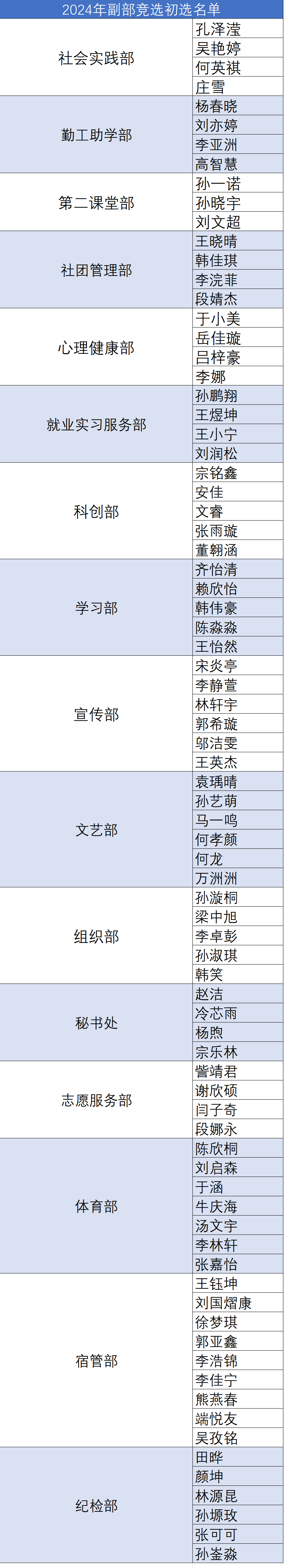 (通讯员:张佳怡)为加强学院团委学生会组织建设,提升学生会工作效能,更好地为广大同学服务,国产自拍 于2024年9月7日上午八点在数科固定教室进行团委学生会副部竞选工作,本着公平、公正、公开原则,经个人演讲和答辩环节,最终确定副部名单,现将结果公示如下:
