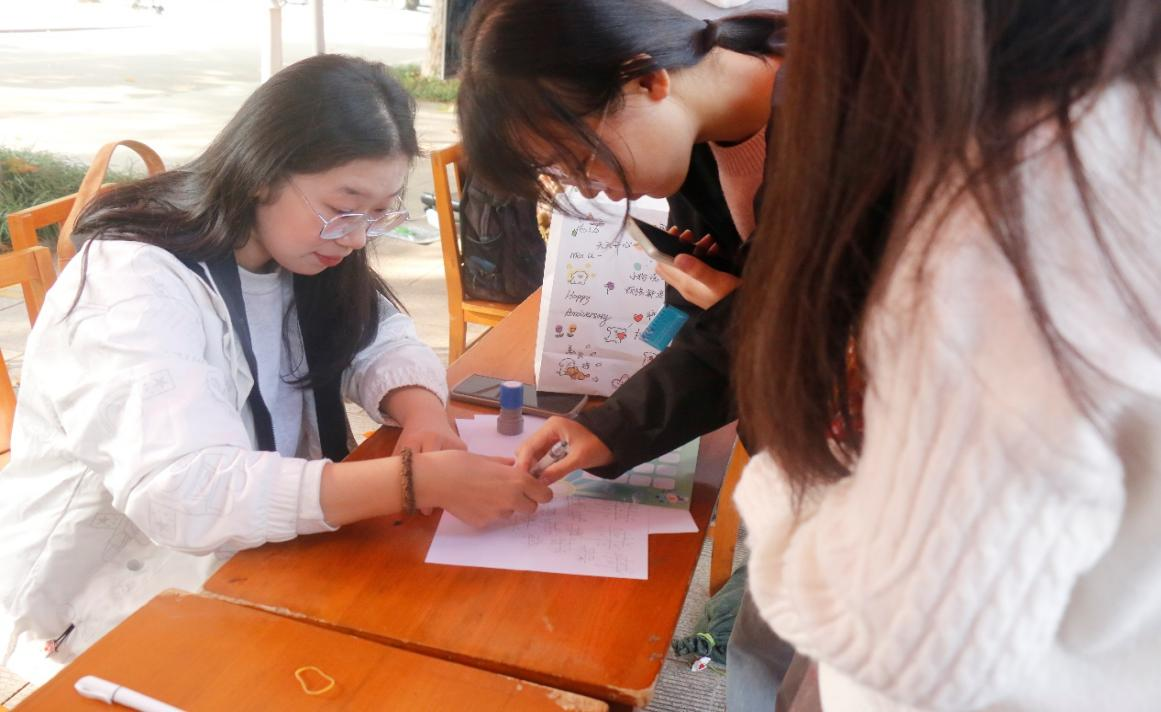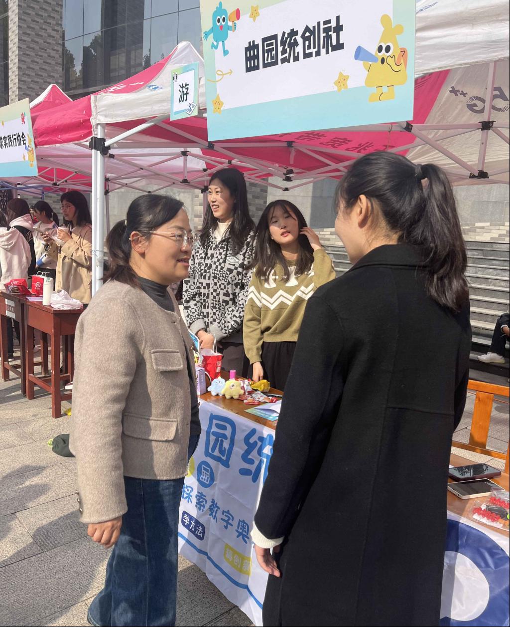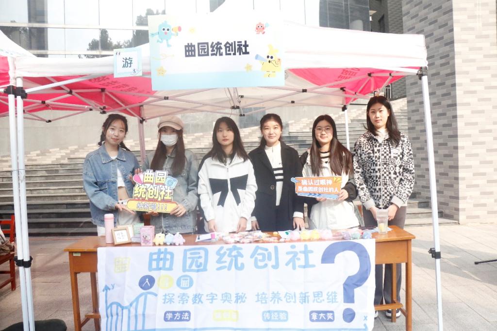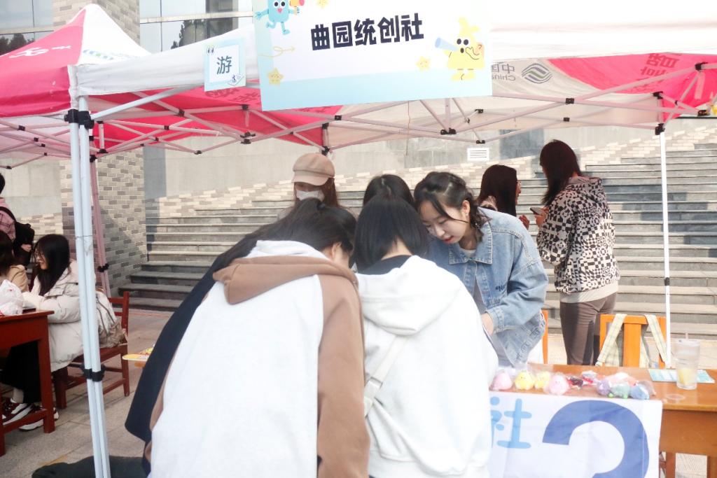 于 11 月 3 日在大学生活动中心前举办百团大战——社团纳新活动。曲园统创社、统计学社、家教协会面向全校同学招新,吸引了大批学生踊跃报名,学院团委书记李宴美来到现场为国产自拍