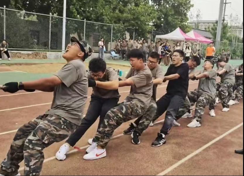 于2024年9月6日下午在西操场组织2024级新生军训拔河比赛。24级辅导员李文静和全体24级新生参加。
