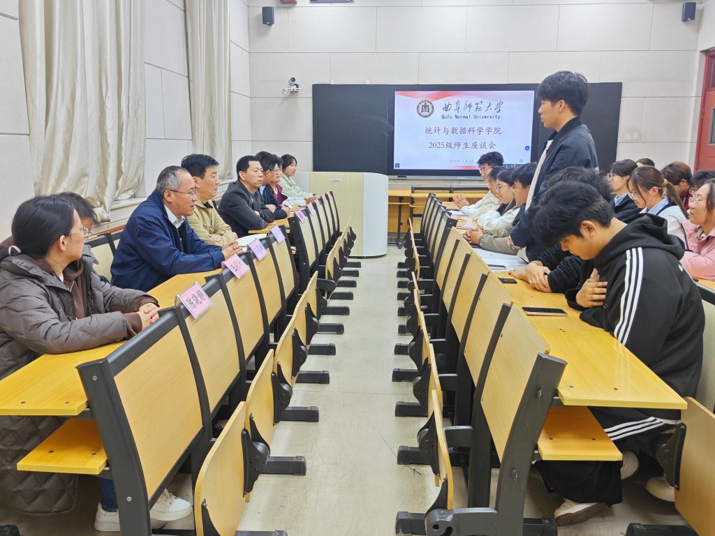 于文史楼211教室举办2025级师生座谈会。院长赵胜利、党委副书记季中、副院长赵翔华、团委书记李宴美、统计系主任陈晓林、数据科学系主任王明秋、教师代表陈晓静、2022级优秀学生代表及2025级新生代表参加座谈会,会议由学院团委书记李宴美主持。