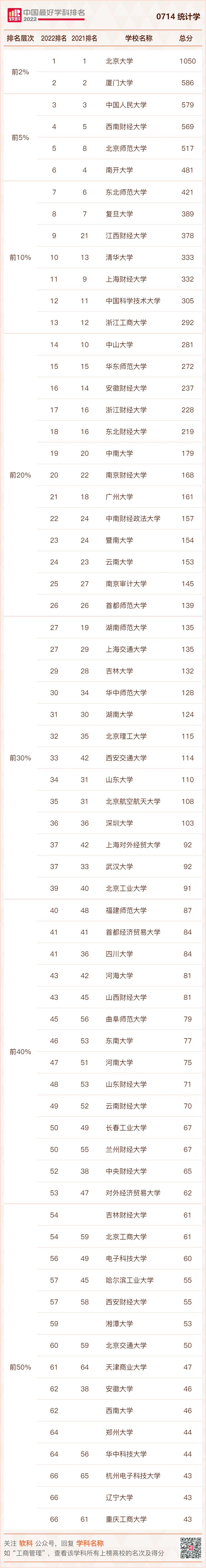 2022年9月21日,高等教育评价专业机构软科正式发布“2022软科中国最好学科排名”。排名榜单包括96个一级学科,各个学科排名的对象是在该一级学科设有学术型研究生学位授权点的所有高校,发布的是在该学科排名前50%的高校。共有484所高校的5035个学科点上榜。其中,统计学学科排名共有68所大学上榜,国产自拍