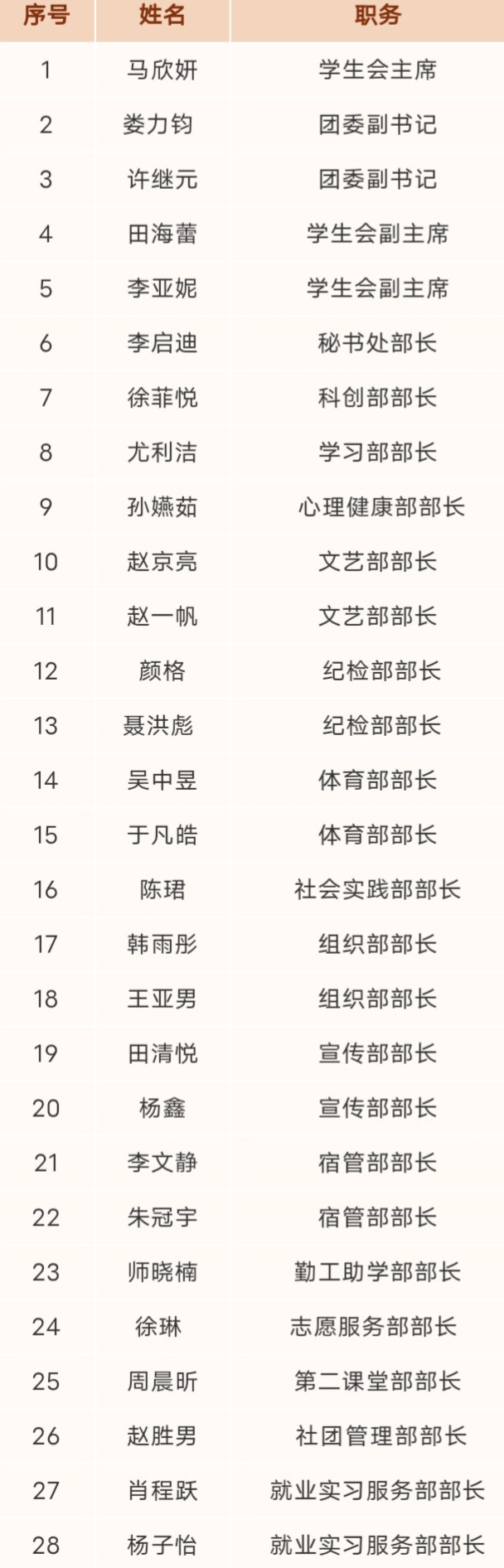 (通讯员:田清悦)2023年4月1日上午八点,国产自拍 第二届团委学生会换届选举会议在综合楼203教室顺利召开。本着公平、公开、公正的原则,经个人申请、竞选演讲、综合审查等环节,最终确定马欣妍等28人为国产自拍 第二届团委学生干部,现将换届名单公示如下: