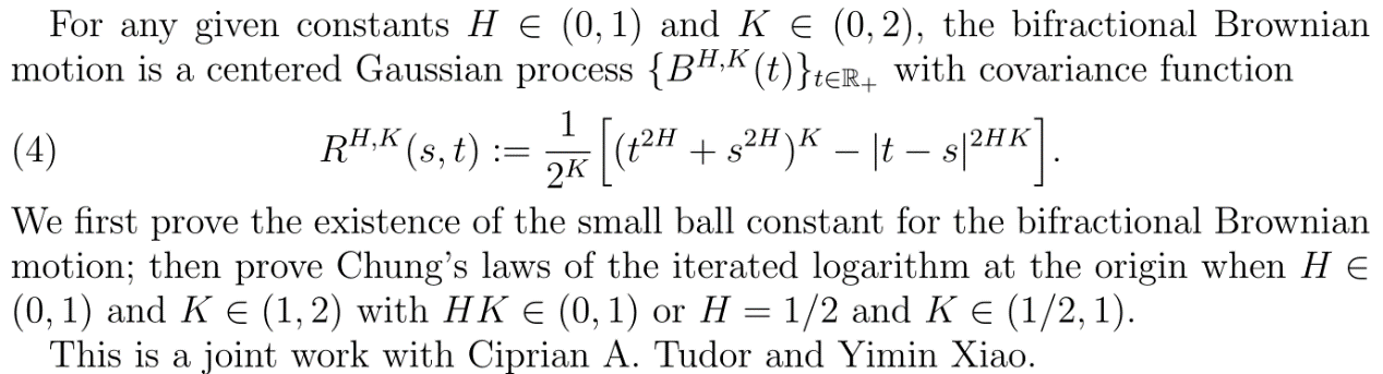 报告题目:Chung-type law of the iterated logarithm for the bifractional Brownian motion at the origin